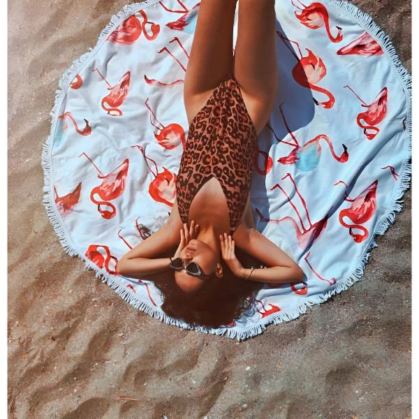 Okrogla brisača je namenjena sproščanju na plaži ali ob bazenu, vendar jo lahko nosite tudi zavezano okoli telesa kot oblačilo.