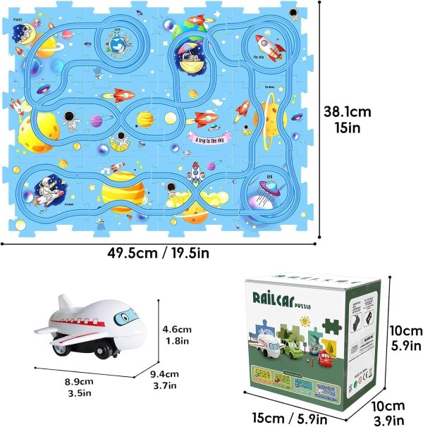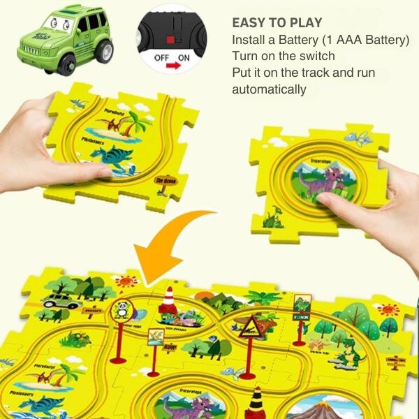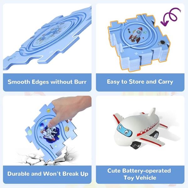 Komplet vključuje različne dele steze, ki otrokom omogočajo enostavno ustvarjanje različnih postavitev, kar izboljša njihovo ustvarjalnost in sposobnosti reševanja problemov.