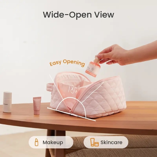 Zasnovana za ženske, ki cenijo lepoto in udobje, ta napihnjena kozmetična torbica zlahka sprejme vse vaše vsakodnevne izdelke za ličenje in nego kože, hkrati pa ohranja svojo obliko in strukturo.
