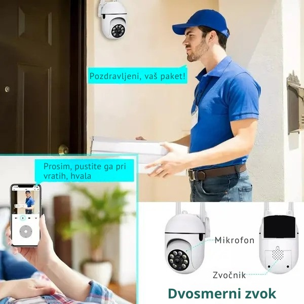 Zunanja varnostna kamera ima vgrajen odzivni mikrofon, s pomočjo katerega lahko poslušate in govorite prek naše aplikacije.  Dvosmerni avdio omogoča komunikacijo z vašimi zaželenimi gosti, s pomočjo alarma za zaznavanje gibanja pa se lahko hitro znebite neželenih gostov ali živali.